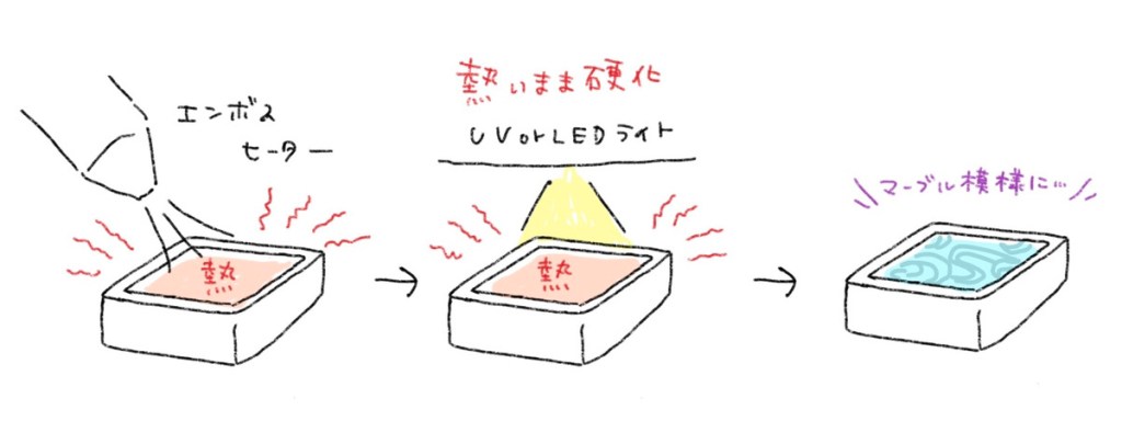 エンボスヒーターなどで気泡を飛ばす場合、エンボスヒーターの熱でレジン液が温まります。